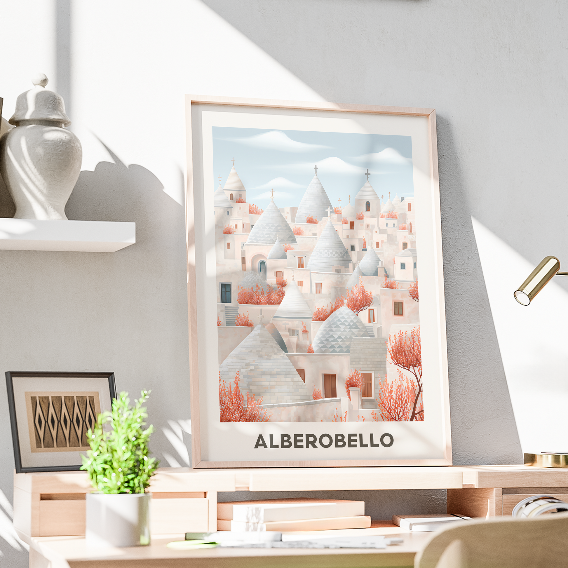 Immerse yourself in the charming streets of Alberobello, Puglia with this stunning illustration print. Capturing the essence of this UNESCO World Heritage site, the artwork showcases the unique trulli houses that dot the landscape.