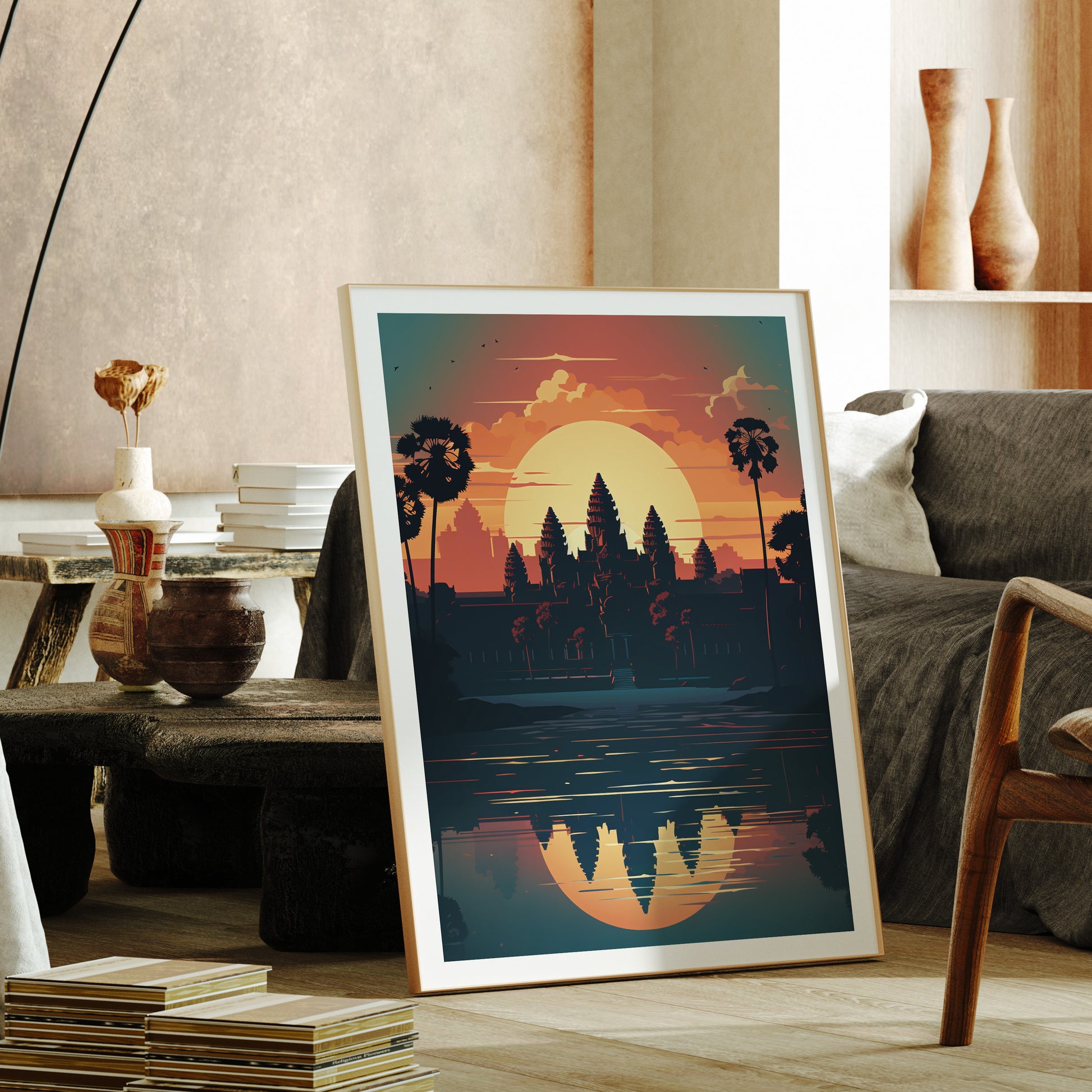 Bathed in a fiery sunset, the ancient temple's stone giants cast long shadows, whispering tales of forgotten kings and hidden wonders. Add a touch of mystical allure and timeless grace to your walls with this evocative wanderlust artwork.